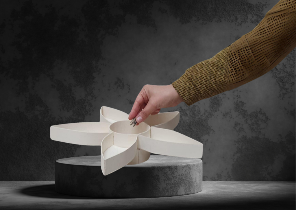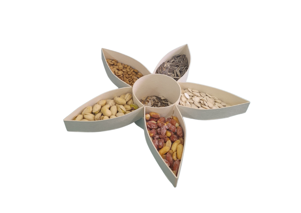 קערת פיצוחים המשלבת עיצוב אלגנטי בהשראת פרח עם פונקציונליות גבוהה.